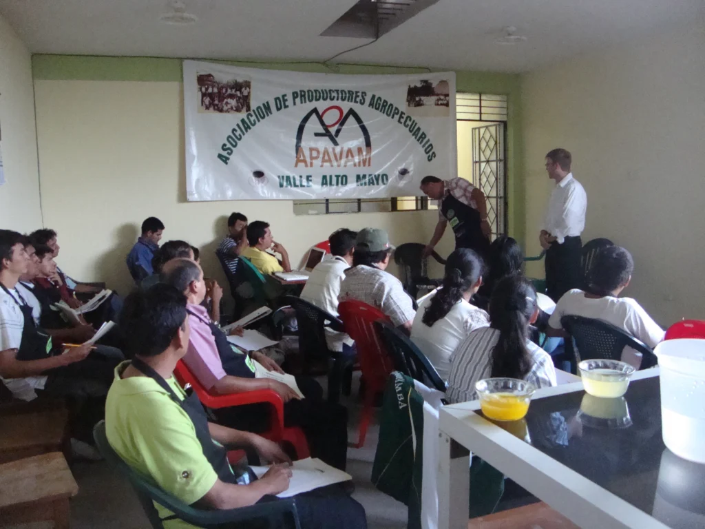 Capacitación, catación de café en Perú, trazabilidad, sostenibilidad y desarrollo de proyectos para fortalecer organizaciones cafetaleras.